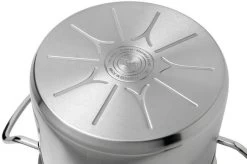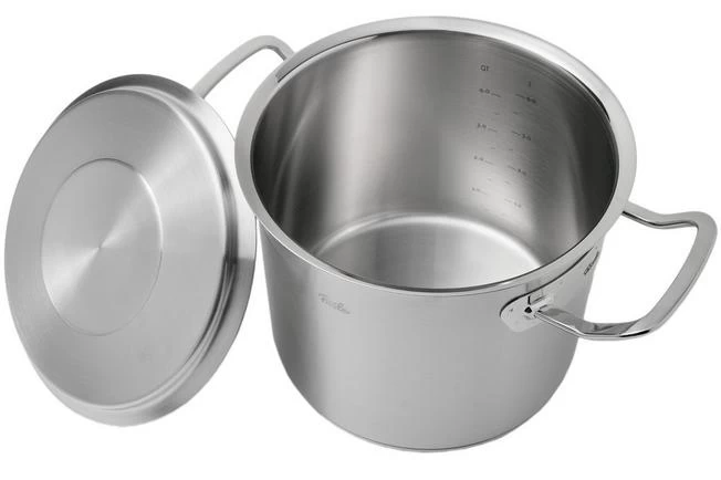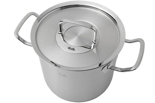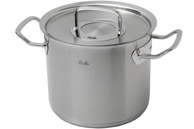 This high cooking pot from the Fissler Original Profi Collection has a diameter of 20 cm and an extra high edge of 17.5 cm. As such it is great when preparing soup. The content of the pan is 5.2 litres, the capacity on the inside is 4 litres.